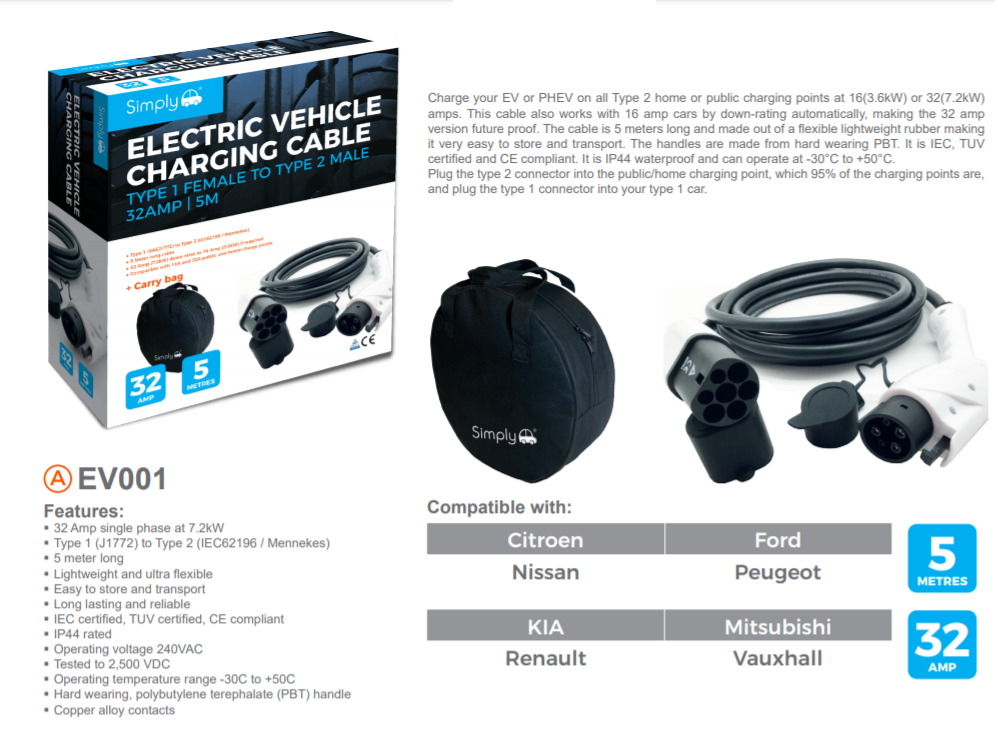 SIMPLY ELECTRIC CAR VEHICLE CHARGING CABLE 5 METRE 32 AMP CLICK 4 FITMENTS