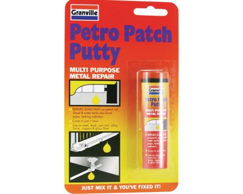 Granville Petro Patch Putty is a hand kneadable, non-rusting, steel reinforced epoxy putty that mixes in one minute to provide a fast permanent repair to items made of ferrous metals and aluminium. Granville Petro Patch Putty is supplied in a handy rod form with the curing agent encapsulated in the contrasting colour base material. Its putty-like consistency eliminates drips and runs providing a 'no mess' application with no tools required for use. Granville Petro Patch Putty dries to a dark grey colour which can be overpainted if required.