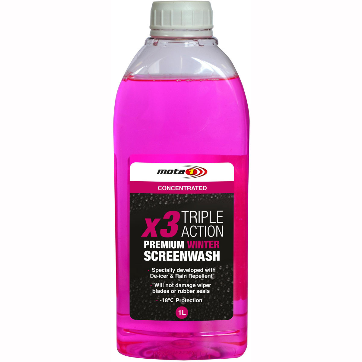 Mota 1 Winter Screen Wash Triple Action ConcentratePerfect for winter: Everybody uses screenwash, Triple Action formula! With added De-Icer and Rain Repellent properties it will clear your windscreen of ice and light frost without a problem. The rain repellent coating also actively repels bugs at the same time, preventing them from sticking to the windscreen. From concentrate, ready to mix with water.